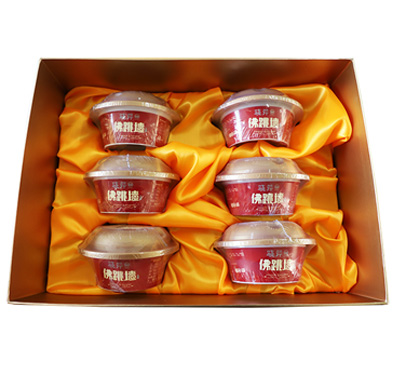 除大連海參外,將鮑魚、花膠、裙邊、螺片、干貝、蹄筋、花菇這些珍貴的食材,經(jīng)科學(xué)配比,再與精心熬制的高湯融合,制作成開袋加熱即食的佛跳墻。