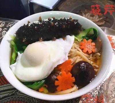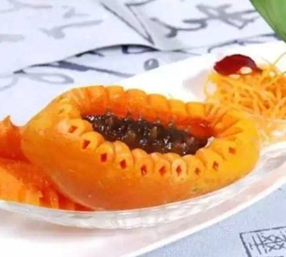 3.將海參丁、蝦仁丁、南瓜丁一同調味制成餡,用冬瓜片包成水晶餃,用生粉封口,入籠蒸制10分鐘取出,盛入盤內,點綴油菜、銀杏、枸杞、鵪鶉蛋、淋芡湯即可